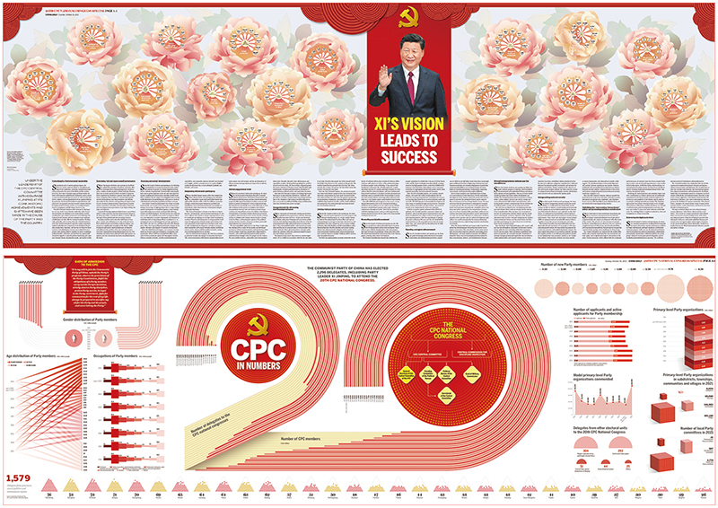 2022年10月16日,中國(guó)日?qǐng)?bào)推出八聯(lián)版,以充滿中國(guó)文化元素、時(shí)尚大氣的設(shè)計(jì),通過(guò)各類數(shù)據(jù),展示新時(shí)代十年偉大變革。 中國(guó)日?qǐng)?bào)社供圖