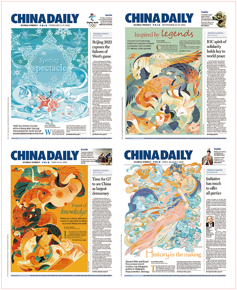 中國(guó)日?qǐng)?bào)“畫時(shí)代”工作室創(chuàng)作飽含中國(guó)美學(xué)意蘊(yùn)的插畫,隨《中國(guó)日?qǐng)?bào)國(guó)際版》周末版全球發(fā)行。圖為與北京冬奧會(huì)“雪花”元素、《山海經(jīng)》、中國(guó)古籍、敦煌飛天相關(guān)的版面。 中國(guó)日?qǐng)?bào)社供圖