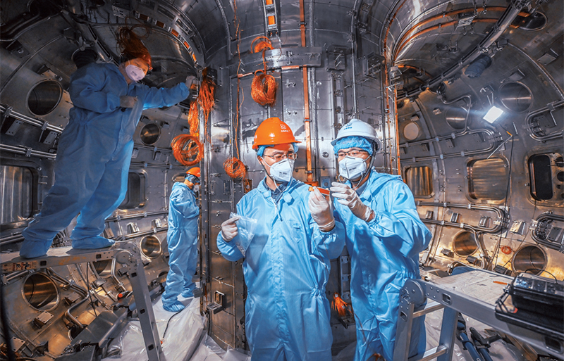 2022年10月,新一代“人造太陽(yáng)”等離子體電流突破100萬(wàn)安培(1兆安),創(chuàng)造了中國(guó)可控核聚變裝置運(yùn)行新紀(jì)錄。圖為2022年4月,中核集團(tuán)科技人員在新一代“人造太陽(yáng)”真空室內(nèi)解決安裝調(diào)試過(guò)程中的技術(shù)難點(diǎn)。 中核集團(tuán)供圖 王雨萌/攝