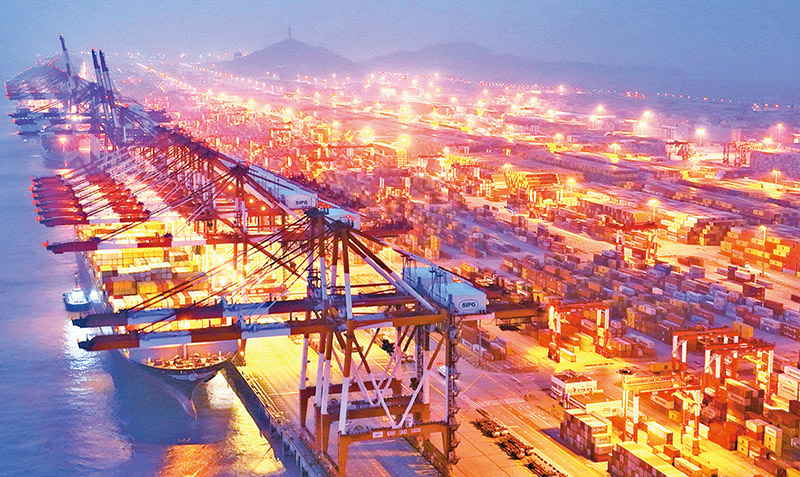 新年伊始,上海港各集裝箱碼頭公司以飽滿的熱情投入到新年生產(chǎn)作業(yè)中,各大碼頭集裝箱吞吐作業(yè)井然有序。圖為2023年2月1日,上海港洋山深水港區(qū)燈火通明,多艘超大型貨輪正在進(jìn)行集裝箱吞吐作業(yè)。 人民圖片 計海新/攝