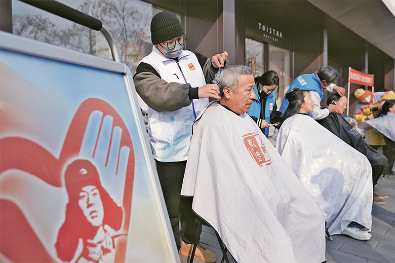 2023年3月4日,在學(xué)雷鋒紀(jì)念日來臨之際,北京市東城區(qū)朝陽門街道舉行學(xué)雷鋒志愿服務(wù)活動(dòng),為居民提供暖心服務(wù),以實(shí)際行動(dòng)傳承雷鋒精神。圖為志愿者為居民免費(fèi)理發(fā)。 新華社記者 鞠煥宗/攝