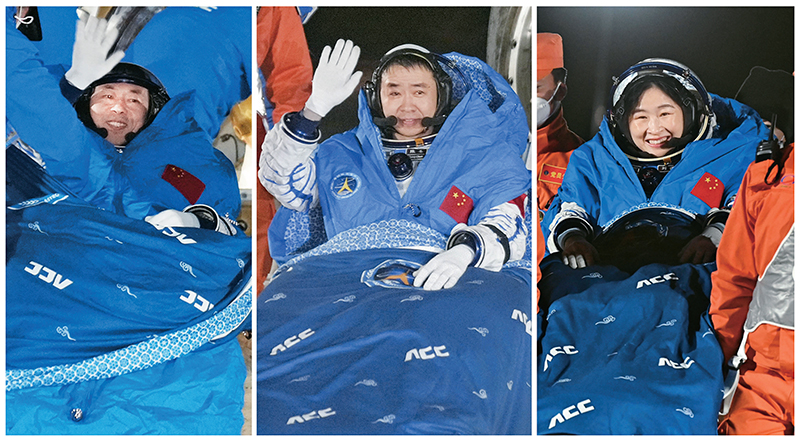 2022年12月4日,神舟十四號載人飛船返回艙在東風著陸場成功著陸。圖為航天員陳冬(中)、劉洋(右)、蔡旭哲安全順利出艙(拼版照片)。 新華社發(fā)