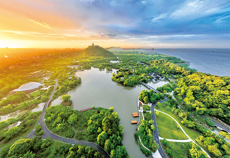 圖為2022年7月,江蘇省南通市五山地區(qū)濱江片區(qū)山水相依,草木蔥蘢,風(fēng)光旖旎。 南通市委宣傳部供圖