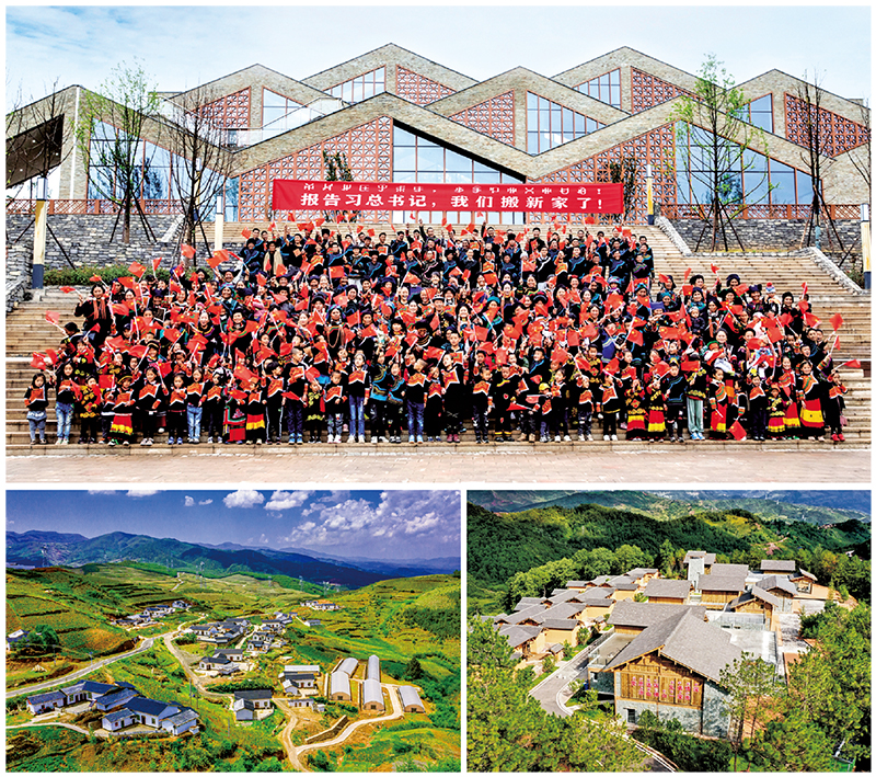 上圖為搬遷群眾在沐恩邸社區(qū)廣場合影;左下圖為火普村全貌;右下圖為三河村易地搬遷安置點(diǎn)新貌(拼版圖片)。 昭覺縣融媒體中心供圖