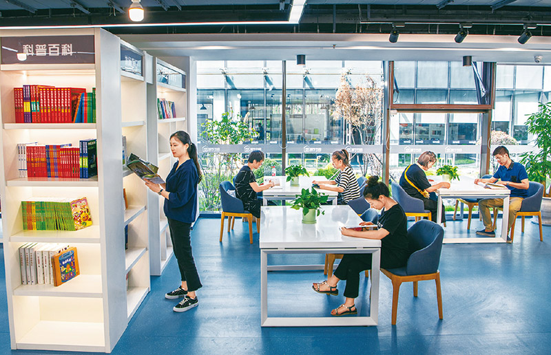 它的空間設計時尚化,匯聚了生活化、人性化、生態(tài)化、智能化和國際化等都市文化休閑的特征,體現(xiàn)出人、書、空間與生活的四維融合;