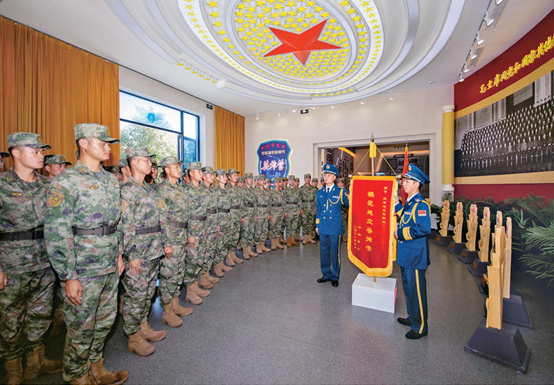 2022年7月28日,“模范地空導(dǎo)彈營(yíng)”官兵在營(yíng)榮譽(yù)室進(jìn)行光榮傳統(tǒng)教育。 周雪峰/攝