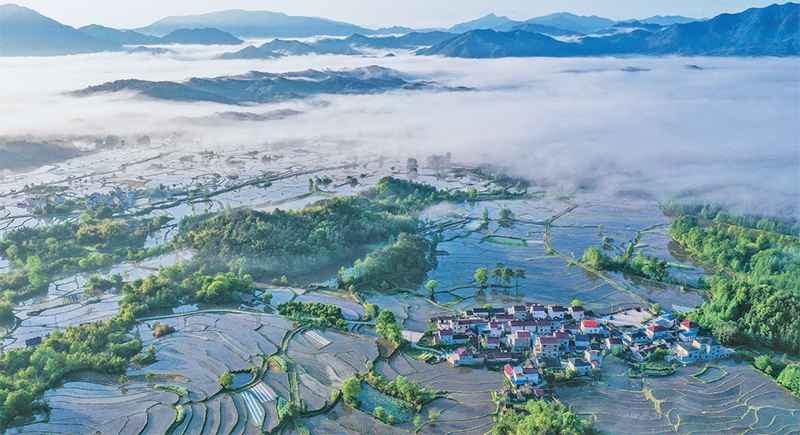圖為2022年4月24日,安徽省宣城市旌德縣興隆鎮(zhèn)三山村的萬畝梯田已經蓄水耕種,朝霞映照形狀各異的梯田,云霧輕拂散落田間的村莊,構成了一幅美麗的鄉(xiāng)村畫卷。 安徽日報社供圖 江建興/攝