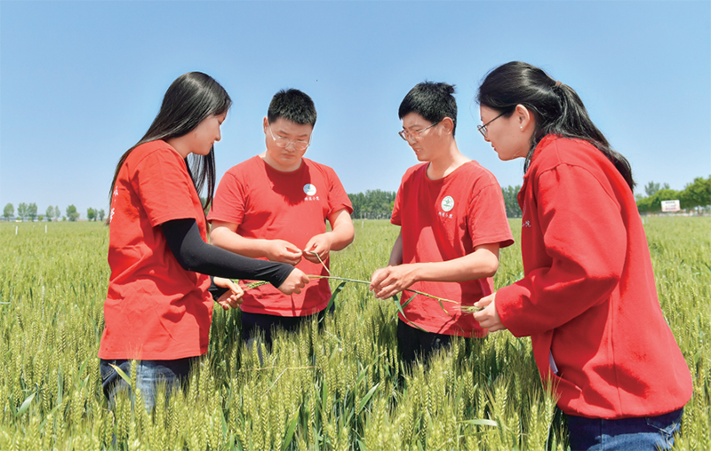 2023年5月1日,習(xí)近平總書記給中國(guó)農(nóng)業(yè)大學(xué)科技小院的學(xué)生回信,強(qiáng)調(diào):“黨的二十大對(duì)建設(shè)農(nóng)業(yè)強(qiáng)國(guó)作出部署,希望同學(xué)們志存高遠(yuǎn)、腳踏實(shí)地,把課堂學(xué)習(xí)和鄉(xiāng)村實(shí)踐緊密結(jié)合起來,厚植愛農(nóng)情懷,練就興農(nóng)本領(lǐng),在鄉(xiāng)村振興的大舞臺(tái)上建功立業(yè),為加快推進(jìn)農(nóng)業(yè)農(nóng)村現(xiàn)代化、全面建設(shè)社會(huì)主義現(xiàn)代化國(guó)家貢獻(xiàn)青春力量?!眻D為5月13日,科技小院的師生在河北省曲周縣“綠色噸半糧”萬畝示范基地查看麥情。 新華社記者 趙鴻宇/攝