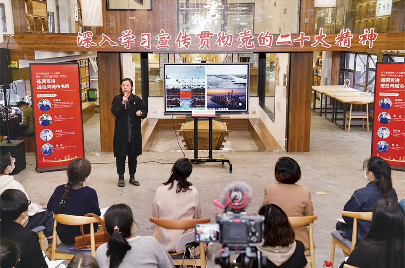 2022年11月18日,浙江省“六學六進六爭先”巡回宣講團走進桐鄉(xiāng)市開發(fā)區(qū)(高橋街道)伯鴻城市書房,以沙龍訪談的形式,向群眾宣傳黨的二十大精神。 桐鄉(xiāng)市委宣傳部供圖