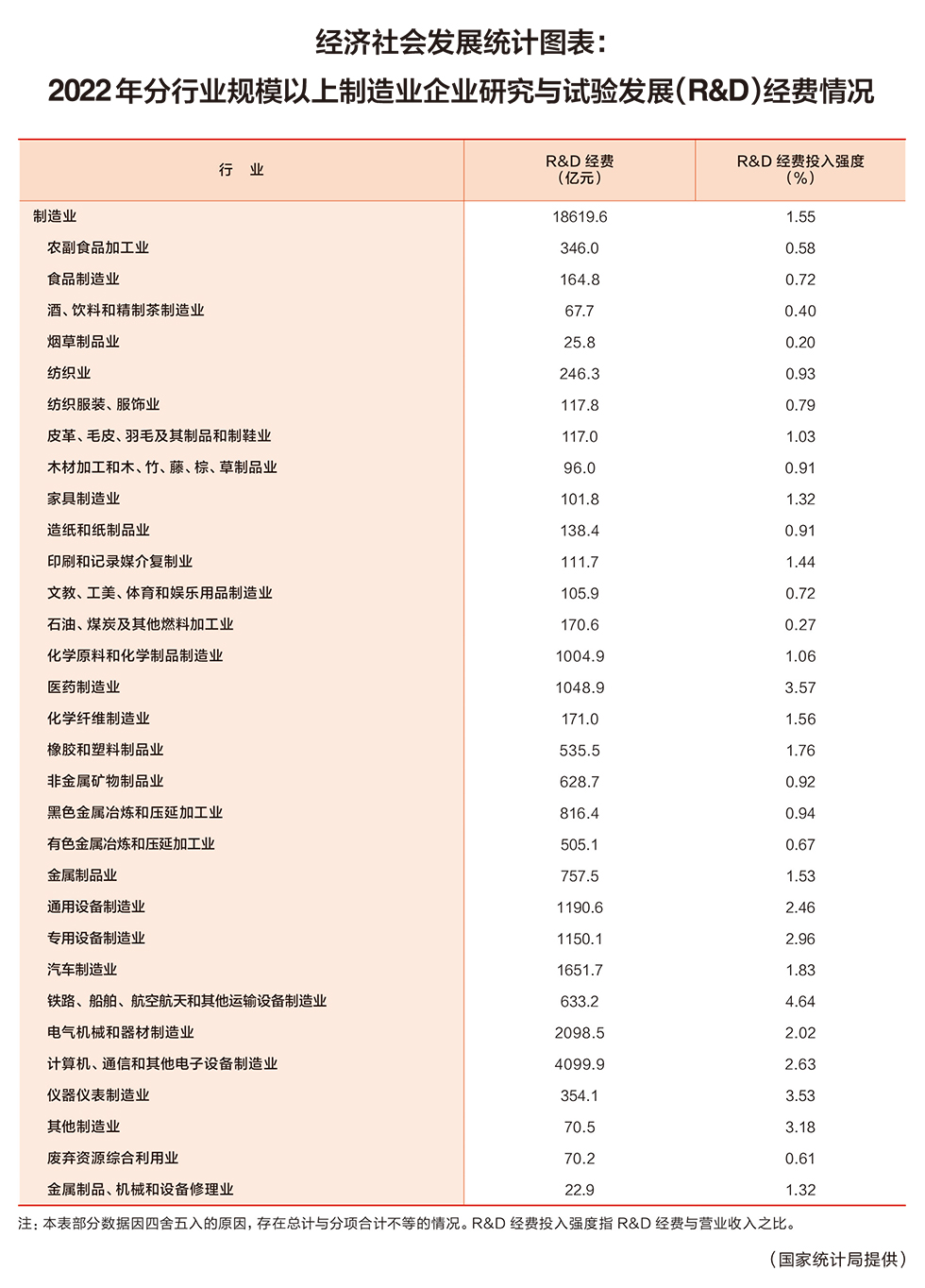 經(jīng)濟(jì)社會發(fā)展統(tǒng)計圖表:2022年分行業(yè)規(guī)模以上制造業(yè)企業(yè)研究與試驗(yàn)發(fā)展(R&D)經(jīng)費(fèi)情況