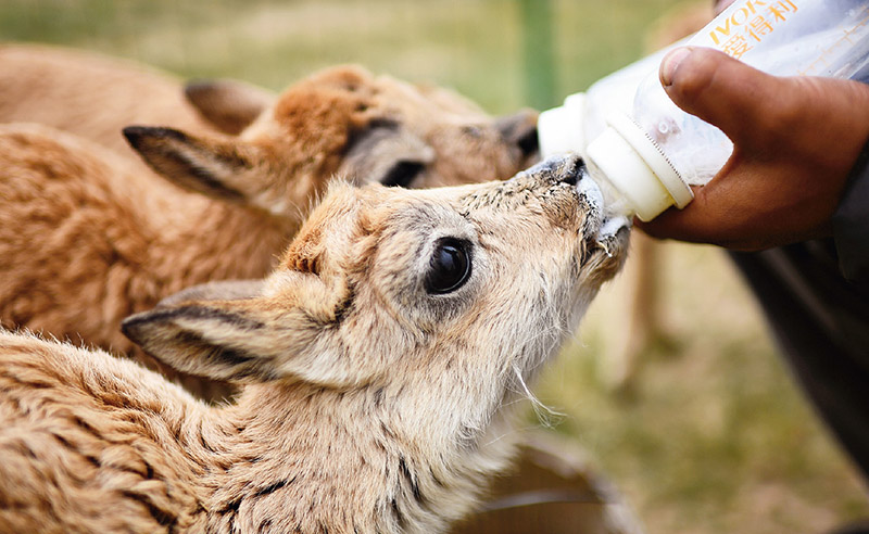 可可西里地處三江源國家公園,是國家一級保護動物藏羚羊重要的棲息地。在可可西里保護站三代巡山隊員幾十年如一日的默默守護下,當?shù)夭亓缪蚍N群數(shù)量已從20世紀80年代初的不足2萬只,增長至現(xiàn)在的7萬余只。圖為2023年7月28日,保護站隊員在給藏羚羊幼仔喂奶。 新華社記者 張宏祥/攝