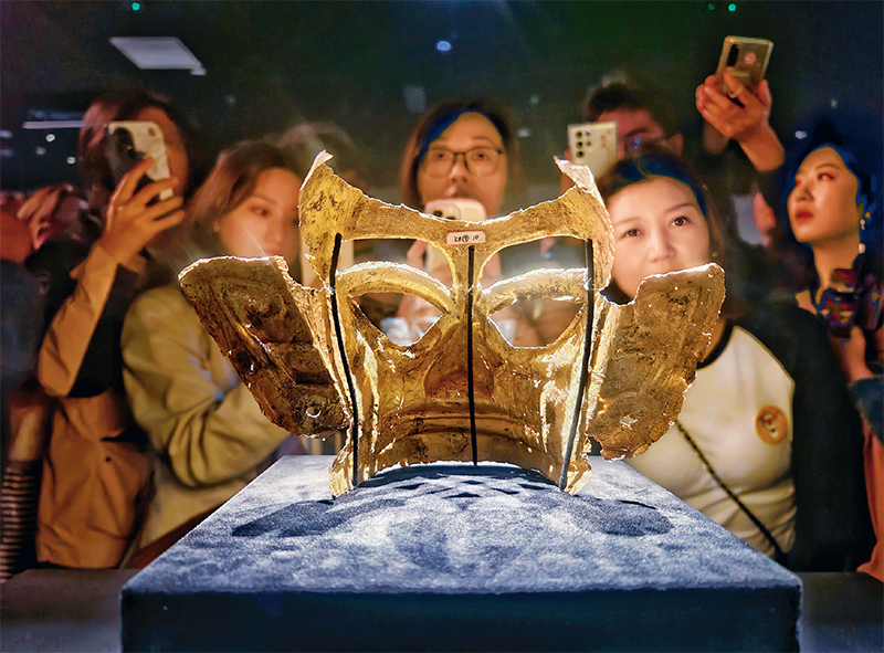 三星堆是我國西南地區(qū)迄今所知規(guī)模最大、延續(xù)時(shí)間最長、出土文物最豐富的先秦時(shí)期遺址。三星堆以“祭祀坑”出土文物為代表,展現(xiàn)恢宏氣勢,在中華文明滿天星斗中熠熠奪目。圖為2023年10月21日,眾多游客在三星堆博物館陳列館參觀金面具。 四川省委宣傳部供圖 周修建/攝