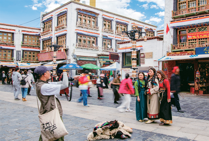 千年八廓街,見(jiàn)證民族團(tuán)結(jié)。2021年7月,習(xí)近平總書(shū)記來(lái)到位于西藏拉薩老城區(qū)的八廓街,感慨地說(shuō):“千年八廓街,是我們各民族建起來(lái)的八廓街。各民族文化在這里交流交往交融,我們中華民族的大家庭在這里其樂(lè)融融?!眻D為2023年6月13日,游客身著藏裝在八廓街拍照留念。 新華社記者 姜帆/攝