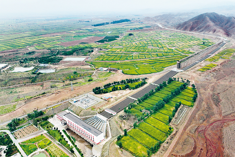 藍天白云下,揚黃渡槽宛如龍頭高高揚起,銀灰色管渠在大地上仿佛一條巨龍匍匐而去,又像一棵茂盛的大樹,干、支、斗、農(nóng)、毛渠仿佛枝丫葉脈生發(fā)開來,所到之處,綠意盎然,生機勃勃。