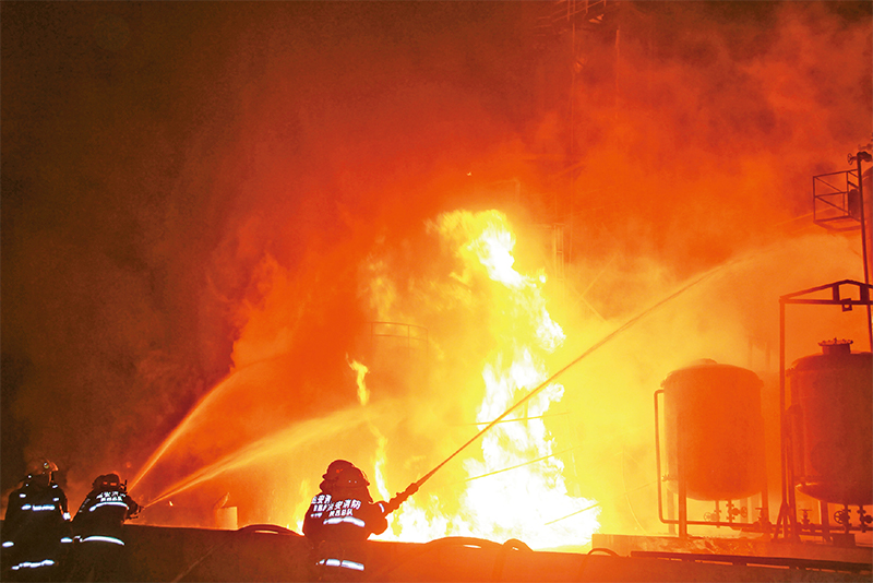 2017年1月,寶塔消防救援站成功撲救某石化企業(yè)閃爆火災(zāi)。圖為救援現(xiàn)場畫面。 應(yīng)急管理部黨委供圖