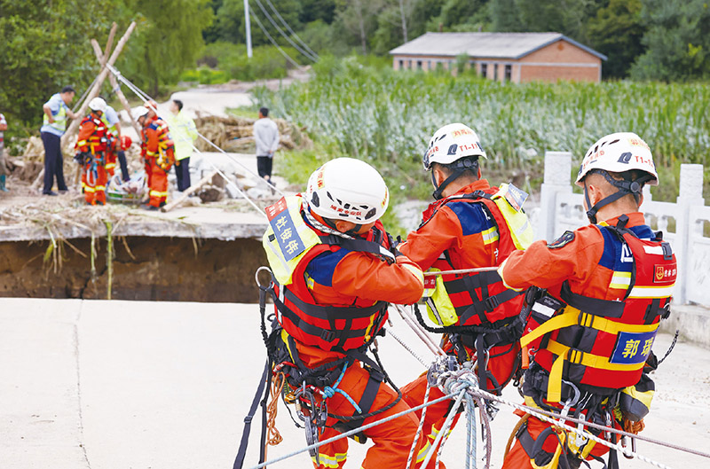 2023年夏,面對影響華北、黃淮、東北等地的嚴重汛情,在以習(xí)近平同志為核心的黨中央堅強領(lǐng)導(dǎo)下,廣大黨員干部為守護人民生命和財產(chǎn)安全挺身向前,千千萬萬人民群眾為保衛(wèi)家園頑強奮戰(zhàn)。圖為8月6日,吉林省吉林市消防救援支隊隊員利用繩橋解救受困村民。 新華社記者 顏麟蘊/攝