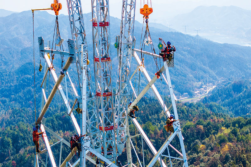 “寧電入湘”特高壓線路工程是我國(guó)首個(gè)沙漠、戈壁、荒漠地區(qū)風(fēng)電光伏基地外送電的特高壓工程。圖為2024年3月12日,電力工人在湖南省益陽(yáng)市安化縣冷市鎮(zhèn)進(jìn)行組塔作業(yè)。 新華社記者 陳思汗/攝