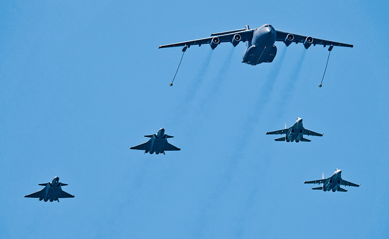 圖為2023年7月24日,在長(zhǎng)春空軍航空開放活動(dòng)預(yù)演當(dāng)天,運(yùn)油20同時(shí)與殲20、殲16飛機(jī)空中加油通場(chǎng)展示。 中國(guó)航空工業(yè)集團(tuán)供圖 岳書華/攝