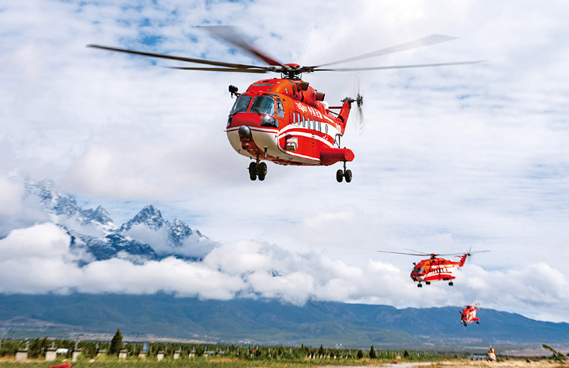 2023年5月16日,國(guó)家“應(yīng)急使命·2023”高山峽谷地區(qū)地震災(zāi)害空地一體化聯(lián)合救援演習(xí)中,直8系列直升機(jī)擔(dān)負(fù)直升機(jī)空中偵察、編隊(duì)突入災(zāi)區(qū)、水域搜救、空地協(xié)同營(yíng)救滅火等任務(wù)。圖為救援演習(xí)現(xiàn)場(chǎng)三架直8A直升機(jī)編隊(duì)起飛執(zhí)行任務(wù)。 中國(guó)航空工業(yè)集團(tuán)供圖 岳書華/攝