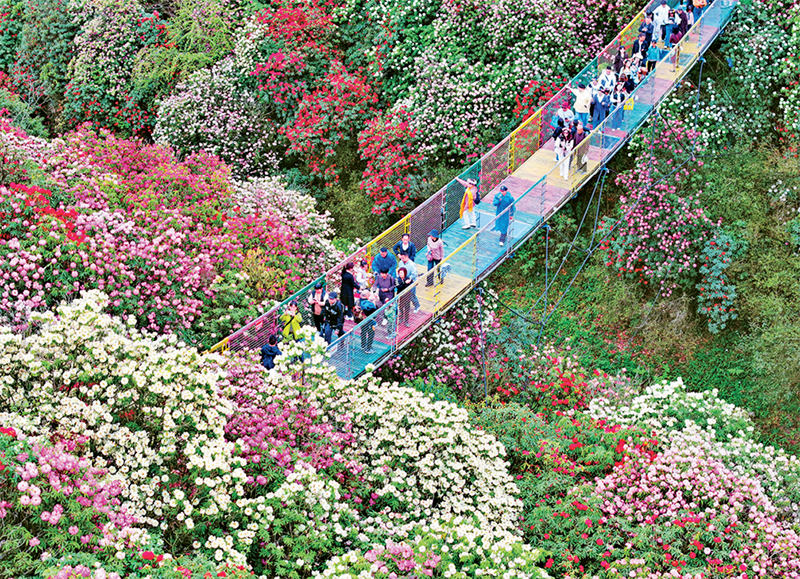 發(fā)展綠色生產(chǎn)力,堅持綠水青山就是金山銀山理念,推動經(jīng)濟(jì)社會發(fā)展全面綠色轉(zhuǎn)型,是滿足人民日益增長的優(yōu)美生態(tài)環(huán)境需要的必然要求。圖為2024年4月4日,游客在貴州省畢節(jié)市百里杜鵑景區(qū)踏青賞花(無人機(jī)照片)。 新華社發(fā) 李華/攝