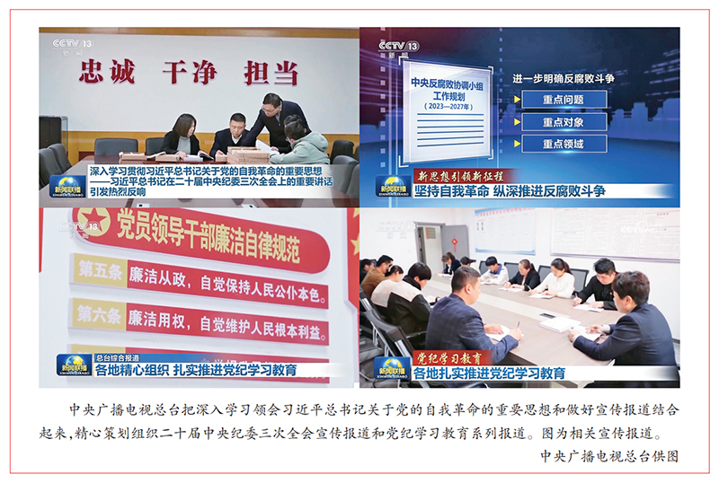 文化而潤其內(nèi),養(yǎng)德以固其本。開展好黨紀(jì)學(xué)習(xí)教育、深入推進黨的自我革命,需要厚植清正廉潔的文化土壤、持續(xù)加強新時代廉潔文化建設(shè)。在中宣部指導(dǎo)下,中央廣播電視總臺充分發(fā)揮黨的宣傳報道主力軍壓艙石的重要作用,把開展黨紀(jì)學(xué)習(xí)教育同做好宣傳報道緊密結(jié)合起來,精心組織推出《黨紀(jì)學(xué)習(xí)教育 各地各部門推動黨紀(jì)學(xué)習(xí)教育走深走實》等相關(guān)節(jié)目報道,營造濃厚輿論氛圍。堅持以習(xí)近平總書記的高度就是宣傳報道追求的高度為標(biāo)準(zhǔn),深入宣傳闡釋習(xí)近平總書記關(guān)于黨的自我革命的重要思想特別是關(guān)于全面加強黨的紀(jì)律建設(shè)的重要論述和黨紀(jì)學(xué)習(xí)教育的重要講話精神,策劃推出一系列深度報道、言論評論、專題節(jié)目,講好習(xí)近平總書記治國理政、管黨治黨、正風(fēng)肅紀(jì)的故事。充分發(fā)揮總臺全媒體傳播優(yōu)勢,解讀好《條例》的重要意義、內(nèi)涵要義和實踐要求,推出更多春風(fēng)化雨、潤物無聲的高質(zhì)量節(jié)目產(chǎn)品,詮釋好我們黨跳出歷史周期率、引領(lǐng)時代的制勝之道。充分發(fā)揮總臺80個海外傳播語種、CGTN融媒體平臺、192個海外站點等國際傳播優(yōu)勢,“一國一策”做好對外宣介,生動展現(xiàn)“中國之治”的獨特魅力,讓世界更好讀懂中國、讀懂中國共產(chǎn)黨,增強中華文明傳播力影響力。