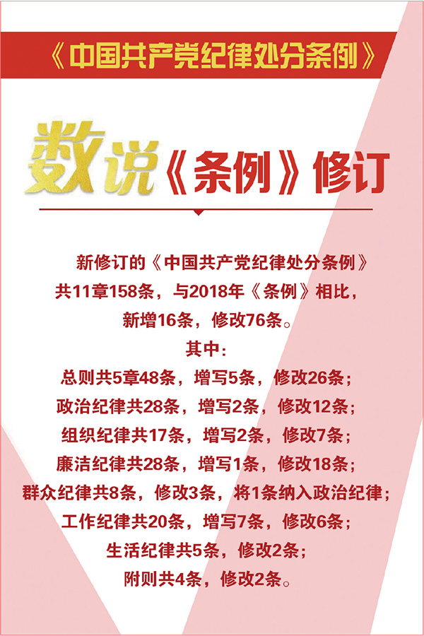2023年新修訂的《中國共產(chǎn)黨紀(jì)律處分條例》,與時(shí)俱進(jìn)完善紀(jì)律規(guī)范,與2018年《條例》相比,新增16條,修改76條,進(jìn)一步扎緊織密制度籠子。