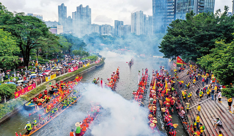 中國式現(xiàn)代化是物質(zhì)文明和精神文明相協(xié)調(diào)的現(xiàn)代化。獵德村是位于廣東廣州珠江新城一座歷史悠久的古村。每年端午期間,獵德村民都會遵照嶺南龍舟文化習(xí)俗,在祠堂和河涌,用各種充滿儀式感的“龍船景”展示對端午文化的傳承。圖為2024年6月10日,十里八鄉(xiāng)的龍舟匯聚在獵德涌參加“龍船景”。 新華社記者 劉大偉/攝