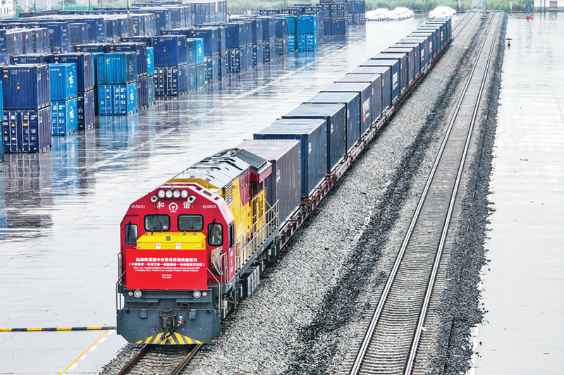 今年以來,我國積極維護(hù)國際產(chǎn)業(yè)鏈供應(yīng)鏈穩(wěn)定暢通,有效滿足世界市場多樣化需求,鞏固拓展經(jīng)貿(mào)合作“朋友圈”,國際循環(huán)的質(zhì)量進(jìn)一步提升。圖為2024年6月27日,西部陸海新通道中老泰馬跨境鐵路班列在重慶江津小南埡站等待發(fā)車。 新華社記者 唐奕/攝