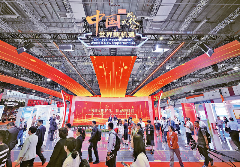 黨的十八大以來(lái),我們堅(jiān)定奉行互利共贏的開(kāi)放戰(zhàn)略,成為140多個(gè)國(guó)家和地區(qū)的主要貿(mào)易伙伴,對(duì)世界經(jīng)濟(jì)增長(zhǎng)的貢獻(xiàn)率保持在30%左右。2023年11月5—10日,以“新時(shí)代,共享未來(lái)”為主題的第六屆中國(guó)國(guó)際進(jìn)口博覽會(huì)在上海市舉辦,展覽面積約36.7萬(wàn)平方米,共有289家世界500強(qiáng)和行業(yè)龍頭企業(yè)參展,均超歷屆水平,折射出中國(guó)市場(chǎng)的巨大吸引力。圖為觀眾在國(guó)家綜合展中國(guó)館參觀。 人民圖片 唐克/攝