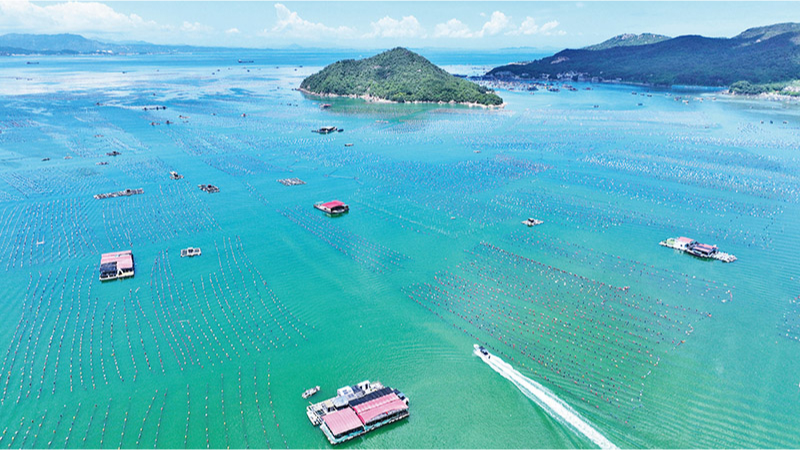 2024年,新修訂的海洋環(huán)境保護(hù)法施行,進(jìn)一步強(qiáng)化陸海統(tǒng)籌、區(qū)域聯(lián)動(dòng)、綜合治理,在海洋污染防治、生態(tài)保護(hù)修復(fù)、監(jiān)督管理執(zhí)法等方面明確一系列創(chuàng)新制度和務(wù)實(shí)舉措。圖為2024年7月21日,在廣東省汕頭市南澳縣深澳鎮(zhèn),萬畝藍(lán)色“糧倉”壯美如畫。 人民圖片 胡江濤/攝