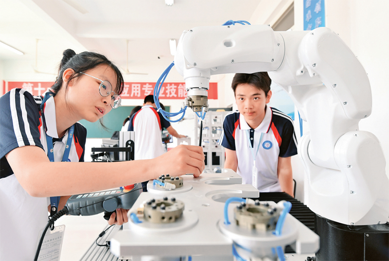 加快實(shí)現(xiàn)高水平科技自立自強(qiáng)、建設(shè)科技強(qiáng)國(guó)和人才強(qiáng)國(guó),需要培養(yǎng)好使用好大批青年科技人才。圖為2024年5月29日,在河北省石家莊市平山縣職業(yè)教育中心工業(yè)機(jī)器人實(shí)訓(xùn)室,學(xué)生進(jìn)行工業(yè)機(jī)器人操作實(shí)訓(xùn)。 人民圖片 張曉峰/攝
