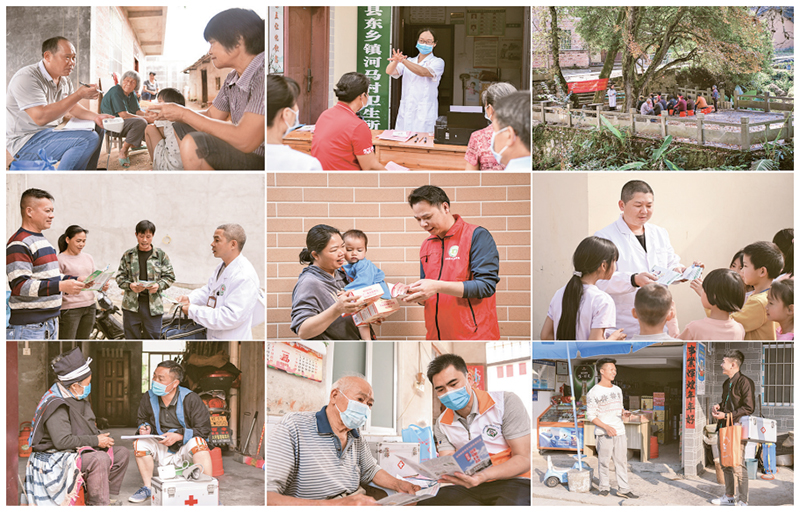 2024年8月19日是第七個(gè)中國醫(yī)師節(jié)。讓更多群眾能在“家門口”看病,是深化醫(yī)藥衛(wèi)生體制改革的重要目標(biāo)。最新數(shù)據(jù)顯示,我國有495萬名基層衛(wèi)生健康工作者,其中有110萬名鄉(xiāng)村醫(yī)生,發(fā)揮著“健康守門人”的重要作用。這張拼版照片顯示的是鄉(xiāng)村醫(yī)生們?cè)诔鲈\中開展健康咨詢及知識(shí)宣傳工作。 新華社記者 曹祎銘/攝