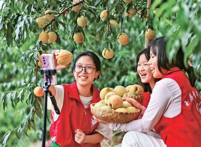 黨和人民事業(yè)發(fā)展離不開一代又一代有志青年的拼搏奉獻(xiàn)。圖為2024年7月30日,在貴州省銅仁市玉屏侗族自治縣新店鎮(zhèn)新店村黃桃種植基地,青年志愿者幫助果農(nóng)直播推銷黃桃。 人民圖片 胡攀學(xué)/攝