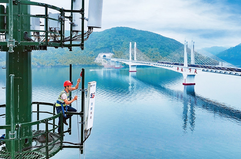 中國電信集中科技力量投入安徽池黃高鐵5G網(wǎng)絡建設,克服山區(qū)、沼澤等復雜地形帶來的重重困難,實現(xiàn)高鐵全線5G網(wǎng)絡高質(zhì)量覆蓋,助力當?shù)亟?jīng)濟社會發(fā)展呈現(xiàn)蓬勃活力。圖為中國電信工程師正在對池黃高鐵沿線的5G網(wǎng)絡基站進行維護。 中國電信集團有限公司供圖