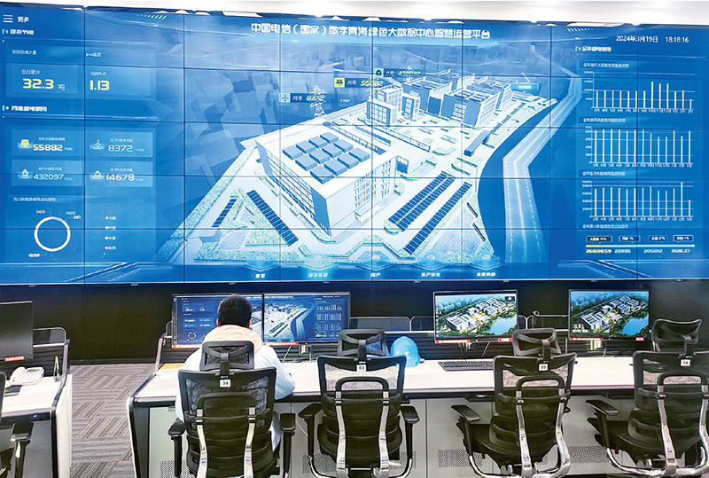 中國首個“零碳”數(shù)據(jù)中心——中國電信(國家)數(shù)字青海綠色大數(shù)據(jù)中心,采用綠電感知溯源算法模型,全面監(jiān)測水電、光伏、風電的千瓦時和占比,記錄消耗的每一度電,并基于源網(wǎng)荷儲一體化綠電智慧供應系統(tǒng),以光伏發(fā)電系統(tǒng)進行園區(qū)儲備和城市電網(wǎng)輸送。據(jù)悉,該數(shù)據(jù)中心已實現(xiàn)“碳中和”與“零碳”排放,年減碳量超30萬噸。圖為2024年3月19日拍攝的該數(shù)據(jù)中心的智慧運營平臺。 中新社記者 李雋/攝