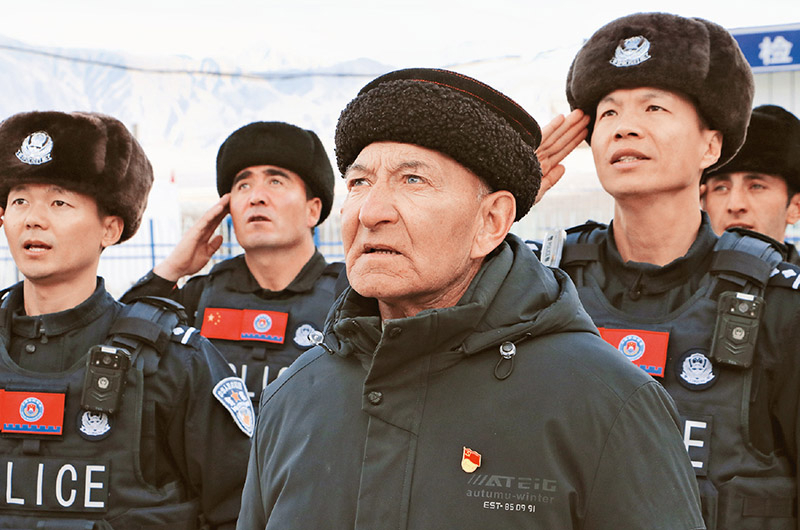 圖為2022年1月2日,巴依卡·凱力迪別克與邊境民警、護(hù)邊員一同升國(guó)旗、唱國(guó)歌。 喀什邊境管理支隊(duì)供圖 謝清肆/攝