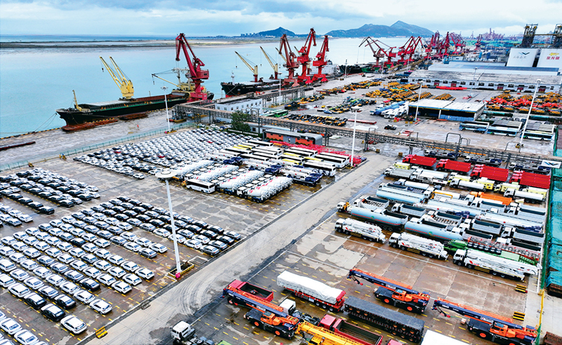 江蘇全面把握在全國開放格局中的發(fā)展定位,發(fā)揮“一帶一路”交匯點優(yōu)勢,聚焦建設具有世界聚合力的雙向開放樞紐的目標,加快推進高水平對外開放,外貿進出口總額連續(xù)多年居全國前列。圖為2024年10月18日,在江蘇省連云港東方港務分公司碼頭,大批國產車輛集港準備裝船(無人機照片)。 新華社發(fā) 王春/攝