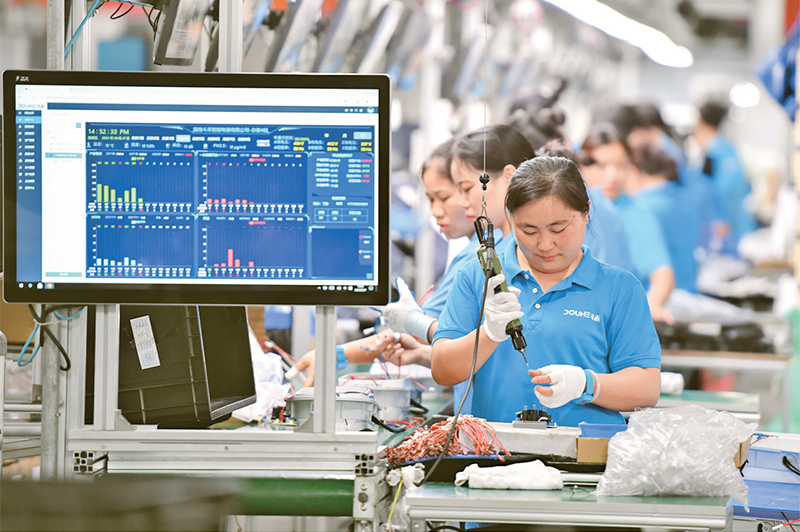堅(jiān)持依靠發(fā)展促進(jìn)就業(yè),在構(gòu)建現(xiàn)代化產(chǎn)業(yè)體系的過程中不斷提升就業(yè)帶動(dòng)力。圖為2024年9月27日,在湖南省長(zhǎng)沙市寧鄉(xiāng)市金洲新城一家智能電器公司,工作人員在生產(chǎn)線上作業(yè)。 新華社記者 陳澤國/攝