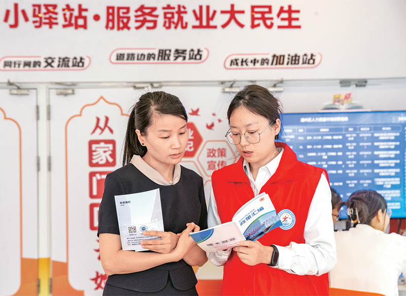 零工市場(chǎng)是向靈活就業(yè)人員與用工主體提供就業(yè)服務(wù)的重要載體。圖為2024年9月3日,江蘇省南通市通州區(qū)萬達(dá)廣場(chǎng)“零工驛站”內(nèi),就業(yè)服務(wù)人員在向求職者介紹就業(yè)創(chuàng)業(yè)政策。 人民圖片 翟慧勇/攝