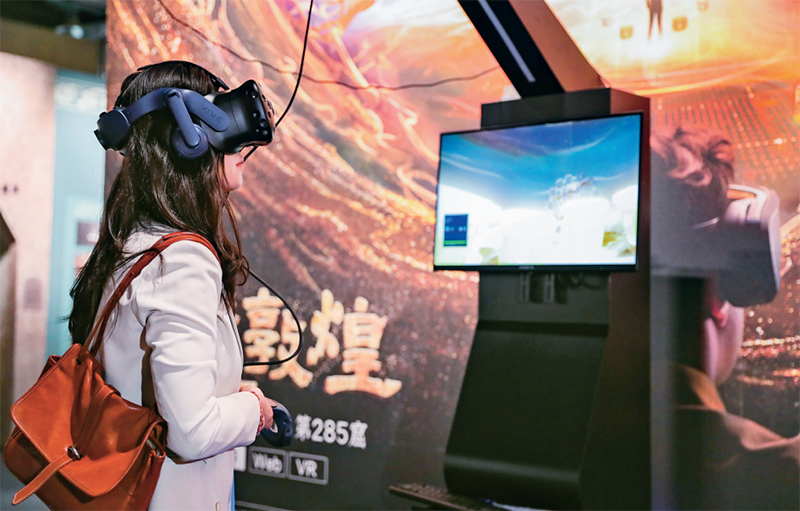 近年來(lái),甘肅不斷深化文化體制機(jī)制改革,推動(dòng)優(yōu)秀傳統(tǒng)文化創(chuàng)造性轉(zhuǎn)化、創(chuàng)新性發(fā)展,文化旅游業(yè)綜合效應(yīng)持續(xù)放大。圖為2024年9月21日,在第七屆絲綢之路(敦煌)國(guó)際文化博覽會(huì)上,與會(huì)嘉賓借助VR設(shè)備沉浸式游覽莫高窟虛擬場(chǎng)景。 新華社記者 郎兵兵/攝