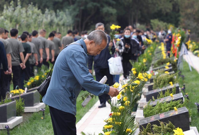9月3日,甘肅省蘭州市在市烈士陵園舉行了烈士骨灰安葬啟動(dòng)儀式,烈士家屬、部隊(duì)官兵代表、參戰(zhàn)老兵代表等社會(huì)各界人士共300余人參加了此次啟動(dòng)儀式。圖為參加啟動(dòng)儀式的代表為烈士獻(xiàn)花。新華社記者 張睿/攝