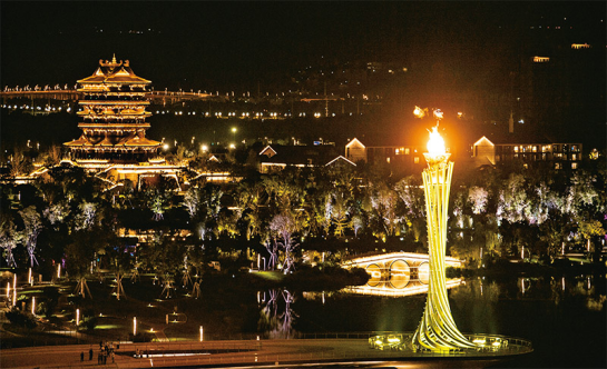 2023年7月28日晚,第31屆世界大學(xué)生夏季運(yùn)動會開幕式在成都東安湖體育公園主體育場舉行。這是成都大運(yùn)會主火炬。新華社記者 曹祎銘/攝