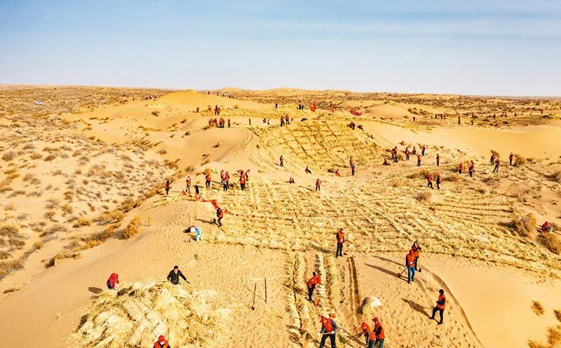 圖為2022年3月甘肅省古浪縣干部群眾義務(wù)壓沙的火熱場景。?古浪縣融媒體中心供圖