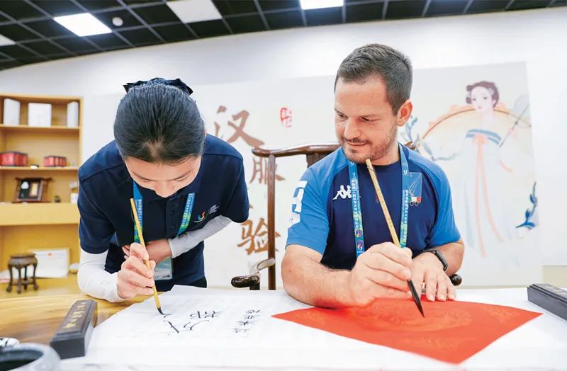圖為2023年7月31日,在成都大運(yùn)村,來(lái)自意大利的達(dá)米亞諾·多梅尼科·瓦萊里奧(右)學(xué)習(xí)用漢字書(shū)寫(xiě)自己的名字。成都大運(yùn)村里設(shè)置了書(shū)法、國(guó)畫(huà)、蜀繡、傳統(tǒng)樂(lè)器等豐富多彩的中國(guó)文化互動(dòng)體驗(yàn)項(xiàng)目。運(yùn)動(dòng)員和教練員在休息之時(shí),紛紛前來(lái)感受中國(guó)文化的魅力,了解學(xué)習(xí)中國(guó)文化。 新華社記者 沈伯韓/攝