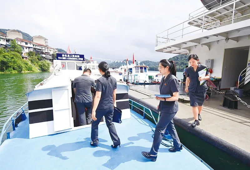 群眾身邊的“小案”,件件關(guān)乎民生、連著民心。湖南省益陽(yáng)市安化縣柘溪水庫(kù)沿岸有8個(gè)鄉(xiāng)鎮(zhèn)。為滿足庫(kù)區(qū)沿岸17萬(wàn)多群眾的司法需求,安化縣人民法院設(shè)立了巡回水上審判庭,當(dāng)?shù)厝罕姺Q其為“水上法庭”。圖為2023年7月19日,安化縣人民法院干警在柘溪客運(yùn)碼頭登上“水上法庭”。 新華社記者 薛宇舸/攝