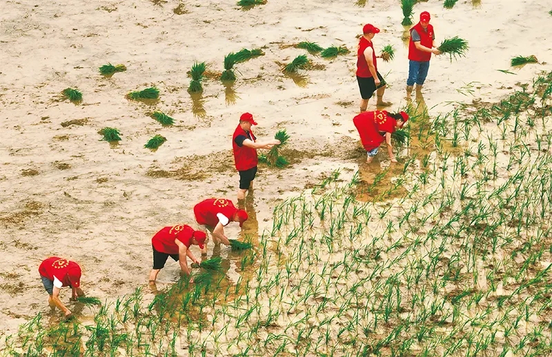 2022年8月4日,在湖南省永州市道縣壽雁鎮(zhèn)玉蟾巖稻作文化園,黨員志愿者在幫助種糧大戶搶插晚稻。正值農(nóng)忙“雙搶”時(shí)節(jié),壽雁鎮(zhèn)組織黨員志愿者深入農(nóng)田一線,幫助農(nóng)民搶插晚稻,助力糧食生產(chǎn)?!⌒氯A社發(fā) 蔣克青/攝