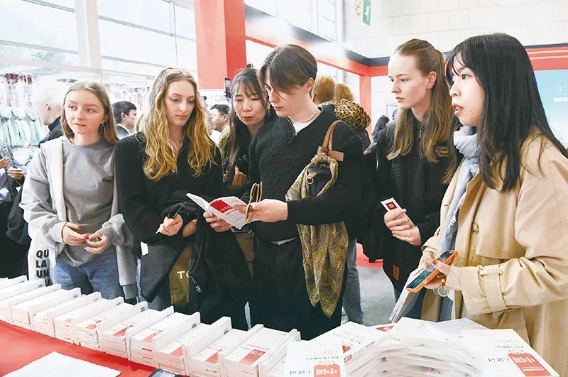 當?shù)貢r間2023年4月27日,中國外文局在第117屆法國巴黎國際博覽會上舉辦“遇·鑒中國”中華文化主題展及系列文化交流活動。圖為中外青年在展覽現(xiàn)場關(guān)注“中國關(guān)鍵詞”全系列多語種主題圖書。?中新社記者 李洋/攝