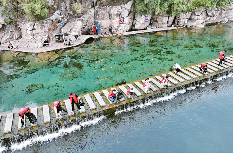 2024年6月5日是世界環(huán)境日。世界環(huán)境日前后,各地志愿者、環(huán)保工作者等以實(shí)際行動(dòng)保護(hù)生態(tài)環(huán)境,守護(hù)美麗家園。圖為2024年6月4日,志愿者在河北省邯鄲市峰峰礦區(qū)黑龍洞風(fēng)景區(qū)撿拾水面雜物。新華社發(fā) 郝群英/攝