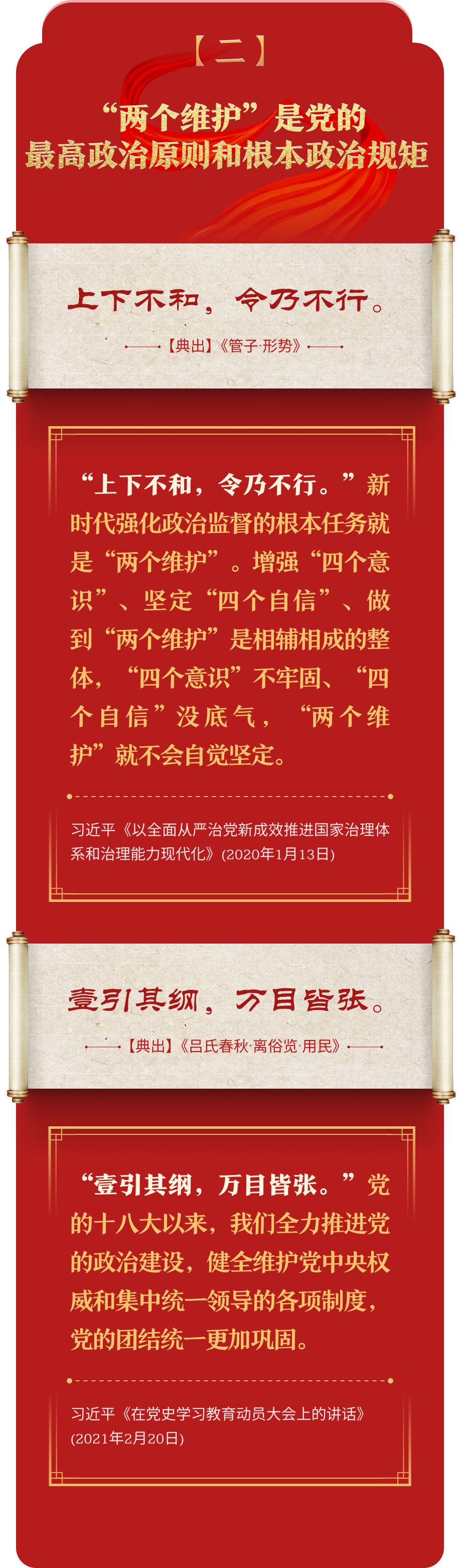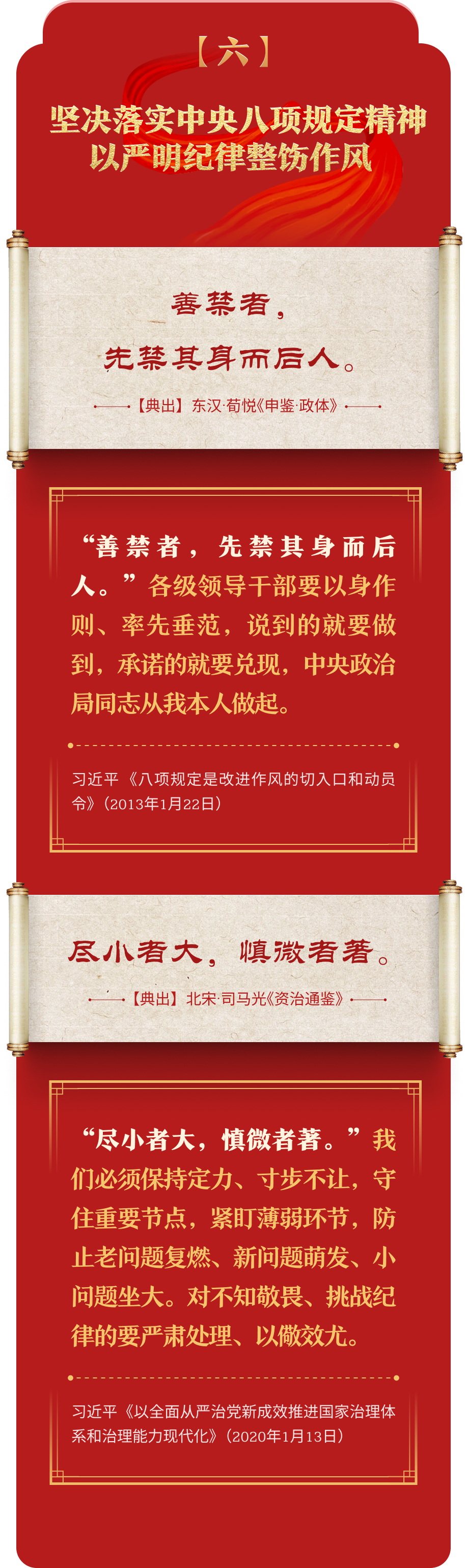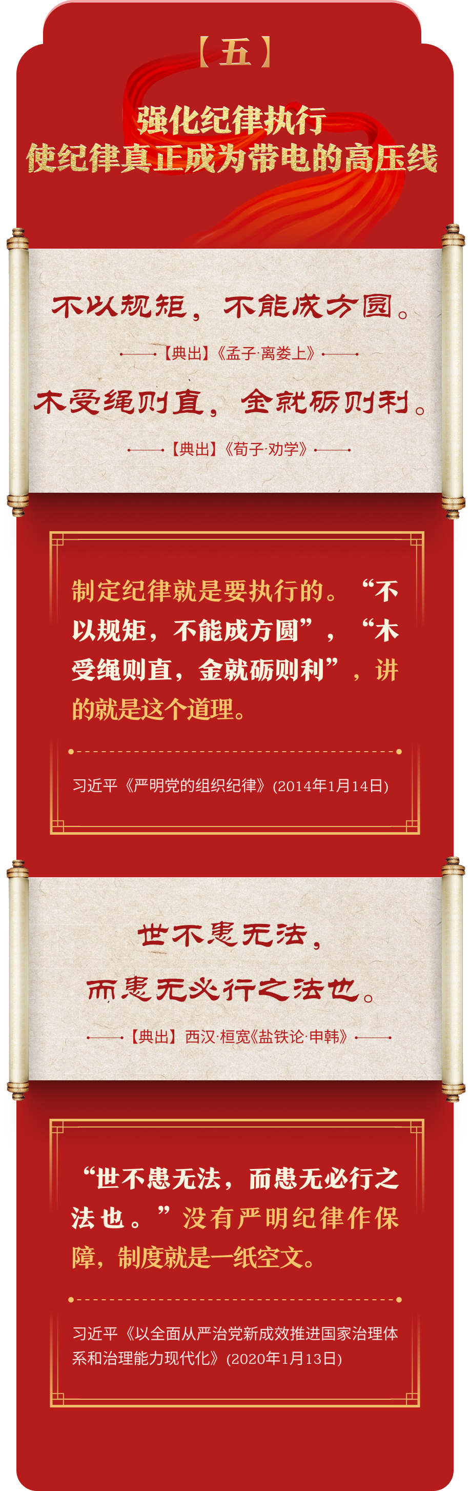 編者按:加強紀律建設是全面從嚴治黨的治本之策。黨的十八大以來,習近平總書記圍繞全面加強黨的紀律建設發(fā)表一系列重要論述,立意高遠,內(nèi)涵豐富,思想深刻,引導黨員干部學紀、知紀、明紀、守紀,真正把紀律規(guī)矩轉(zhuǎn)化為政治自覺、思想自覺、行動自覺,確保全黨目標一致、團結(jié)一致、步調(diào)一致。在這些重要論述中,總書記精妙運用古代典籍經(jīng)典名句,以古喻今、啟迪思想、激蕩精神,讓我們一起來學習!